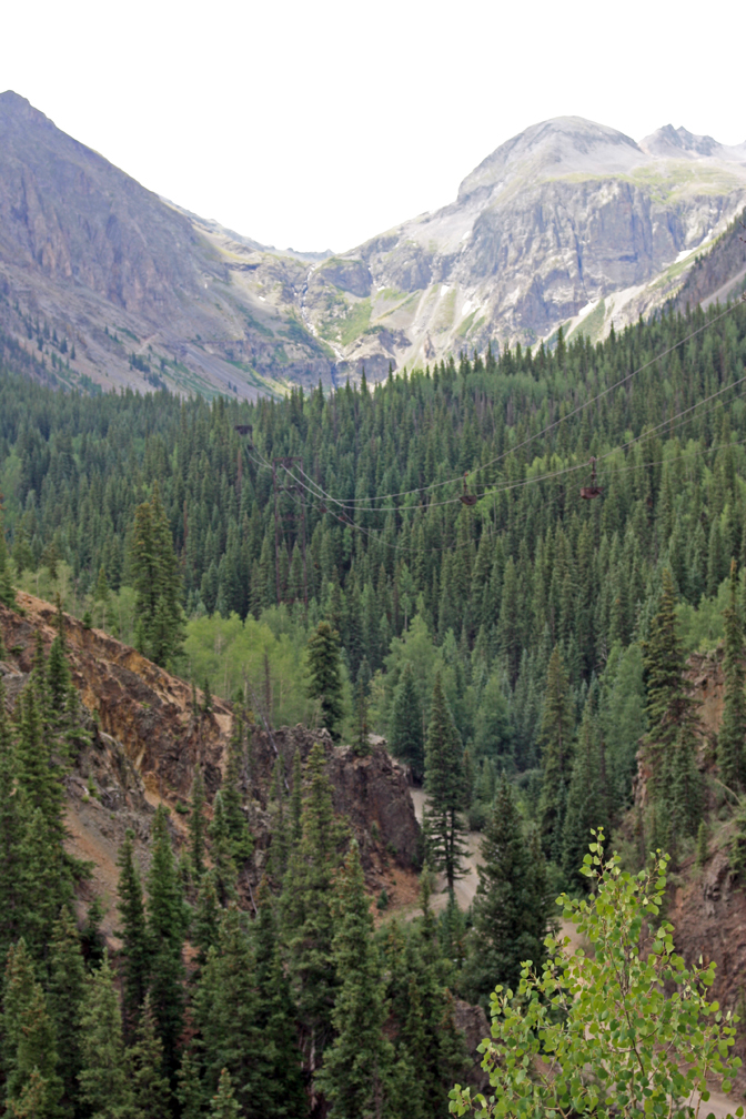 The aerial tramline connecting the Shenandoah-Dives Mine above Arrastra Gulch with the Mayflower Mill. The gulch is the canyon in the foreground, and the high circque is the basin around Silver Lake.