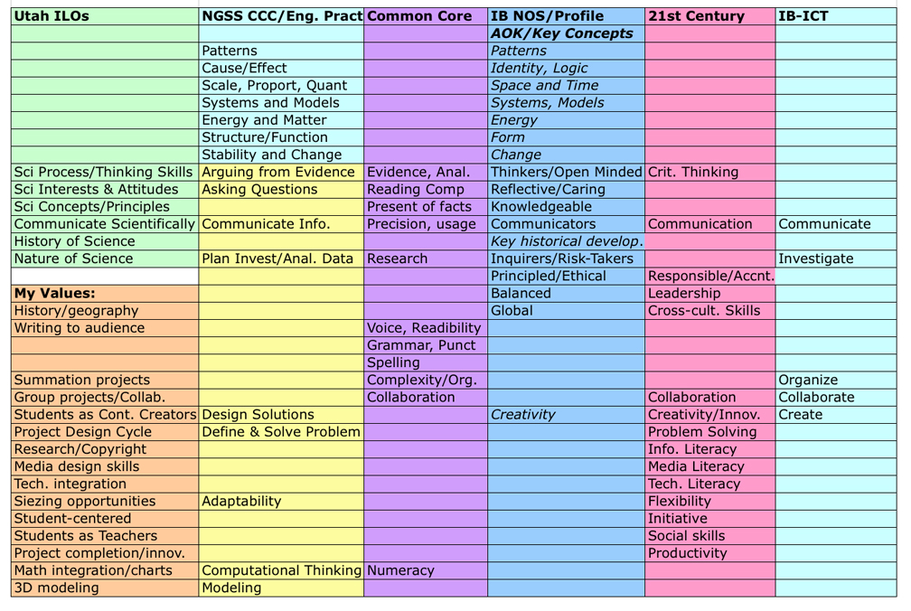 Key: Orange: My own personal priorities/standards. Light green: Utah Intended Learning Outcomes. Light aqua: NGSS crosscutting concepts. Yellow: NGSS Engineering Practices. Purple: Common core. Blue: International Baccalaureate Nature of Science, Learner Profile, and Science Key Concepts. Pink: 21st Century Skills. Light Aqua: IB Information and Communication Technology standards.