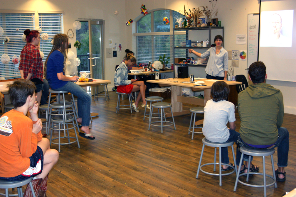 They practiced their lessons, as much as we had time, and presented them to their peers in class. This was their alpha test. There were many creative projects. One student (Jessica) brought in some old speakers. We cut holes through the grills over the woofers and glued wires to the center of the woofers, then glued small mirrors to the wires.
