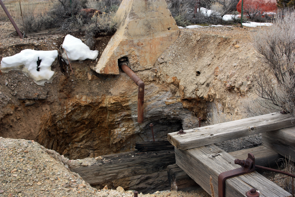 Collar and shaft at the Tintic Standard Mine. Even with a chain link fence around the hole, the loose soil at the collar could cave in and makes this shaft a dangerous place if you get too close.