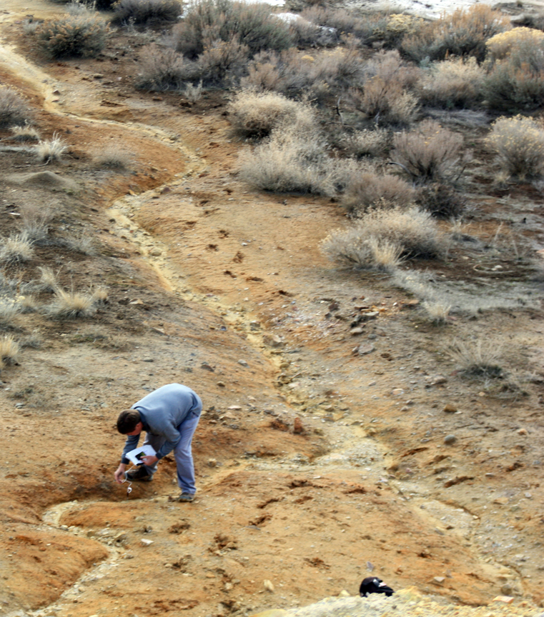 Since last week, the snow has mostly melted and the ground dried out to where we could walk on it in most places without leaving muddy footprints. We sampled in several washes running off the main dump and in soils between the washes where some scrub brush survives. The main wash feeding off of the dump had several layers of brightly colored soils, ranging from reds to yellows to even a shade of green.