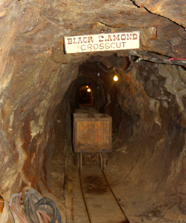 Once the mining company buys out the prospectors, it starts to build the infrastructure needed to enlarge the mine. The irregular prospector shafts and adits are enlarged and shored up with timbers. The top of a shaft is boxed in with a “collar” and an adit’s entrance is shored up and extended outward to prevent loose rock from falling into it. This becomes a “portal.” At the top of a shaft, a “headframe” or “gallows frame” is erected out of large timbers or steel with pulleys called “sheave wheels” at the top. A braided rope or cable is brought over the sheave wheel and attached to a metal cage called a “skip” which can carry men or ore buckets in and out of the shaft. The other end of the cable is brought to a “hoist,” which is an electric or diesel winch. As the skip is raised and lowered in the mine, a series of electric bell chimes are used to signal the “hoistman” how far to raise and lower the skip. A mark on the cable tells the hoistman when the skip is “on the level.”