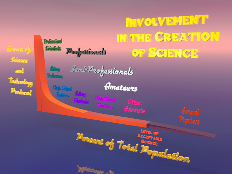 If we were to chart the amount of science education content produced on a vertical axis and the number of people engaged in producing that content on a horizontal axis, we find an interesting distribution called a Pareto curve, having a steep drop off on the left trailing off to a long shallow curve that never entirely reaches zero on the right. Currently, most content for science education is produced by a few professional curriculum designers and publishers. Some college courses are created with a professor contributing expertise and an outline of topics then handing the course design over to the college’s Instructional Design department to build the curricular pieces and content. Occasionally a high school teacher might act as a co-author or reviewer of a textbook, yet the vast majority of curriculum, lesson plans, tests, and texts are still created by professionals with years of training. Yet a long tail exists of semi-professionals and amateurs, including teachers and students and even experts in the general public who can contribute content that is equally valid (and much richer in subject matter and variety) than the professionals. If this tail could be tapped, the total content available would drastically increase, as shown by the area under the curve in the second diagram.